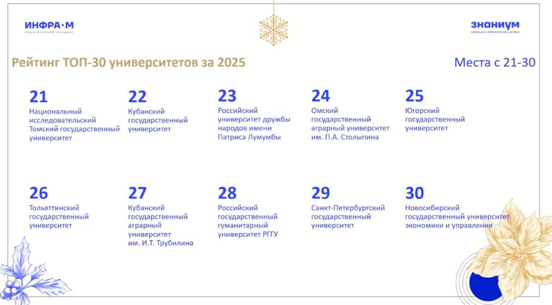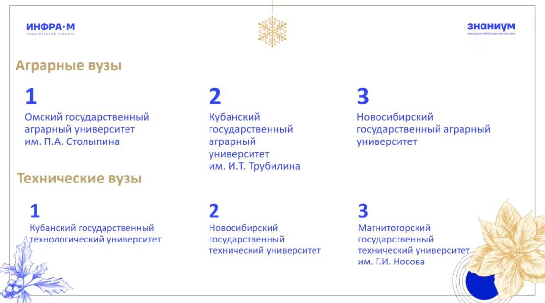 По многолетней традиции в конце уходящего года электронно-библиотечная система Знаниум подводит итоги своей деятельности и определяет лидеров чтения среди образовательных организаций. По итогам 2025 года Омский ГАУ возглавил рейтинг самых читающих аграрных вузов России и сохранил 24 место в топ-30 самых читающих вузов страны, уверенно конкурируя с ведущими университетами и демонстрируя высокий уровень интереса к знаниям среди студентов и преподавателей.